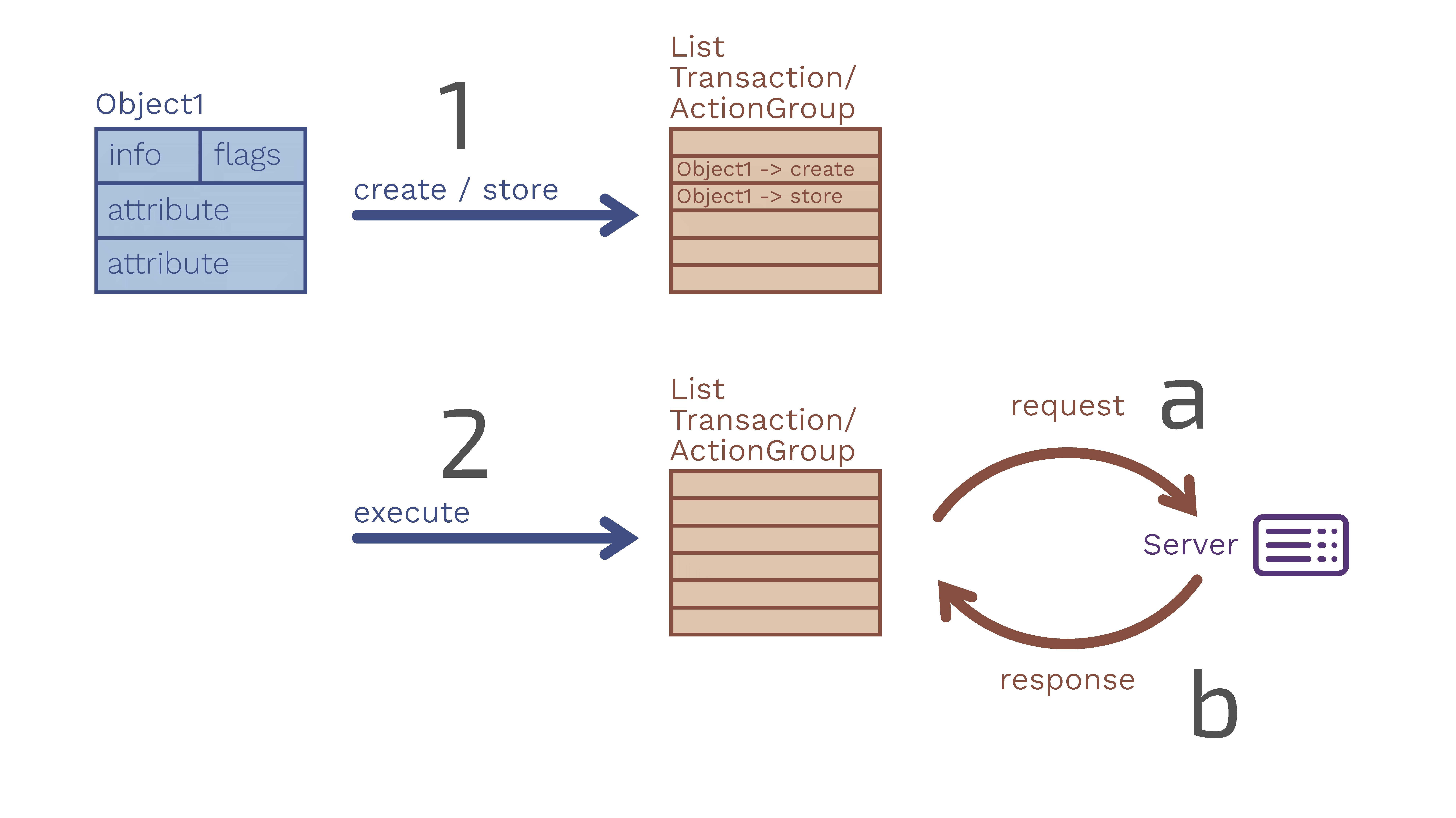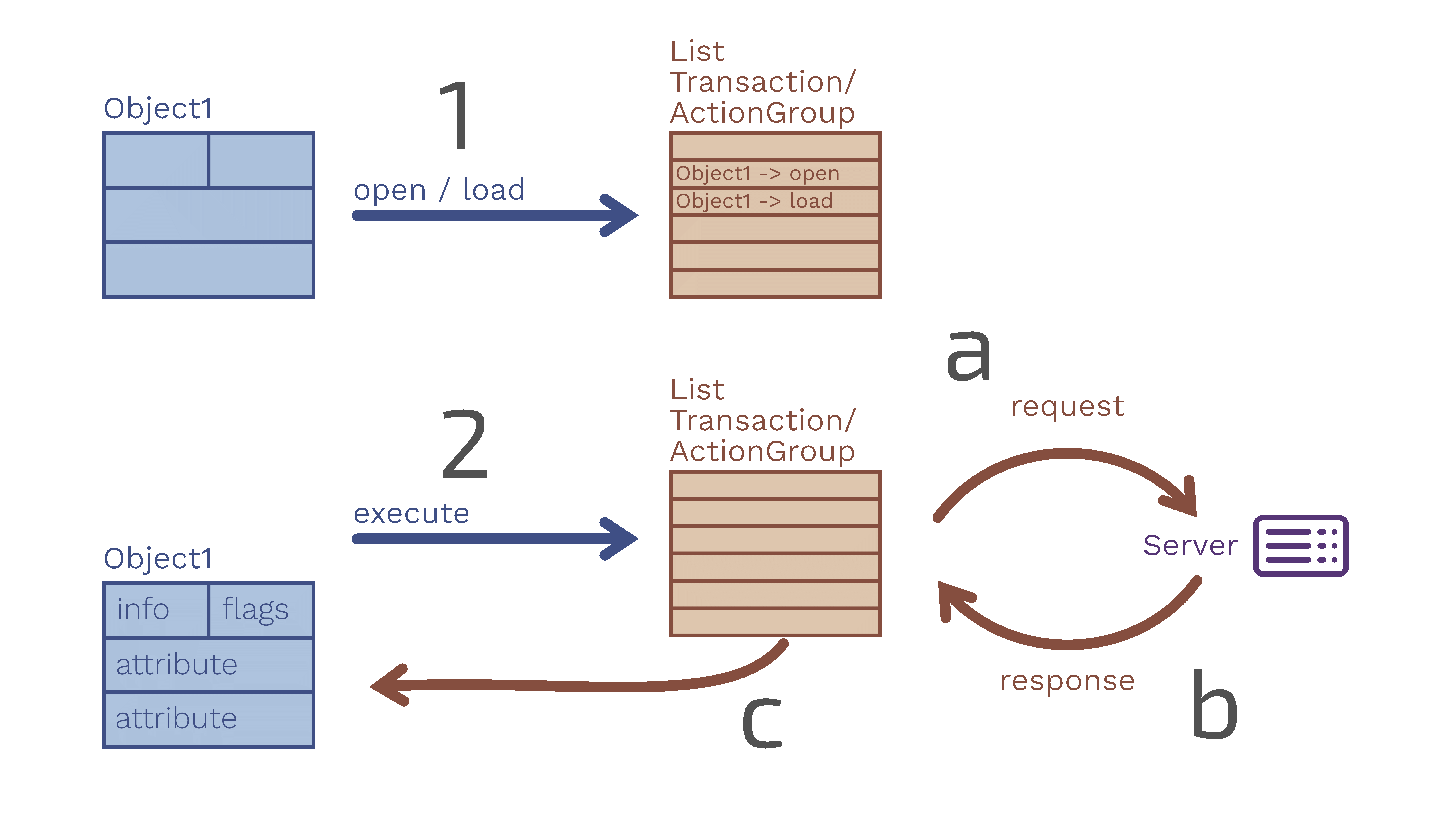 This list gets updated with all the changes and as soon as we execute (2) the transaction starts the request (a) to the server which in turn responds (b). When we open or load, our object will be updated by the List (c).